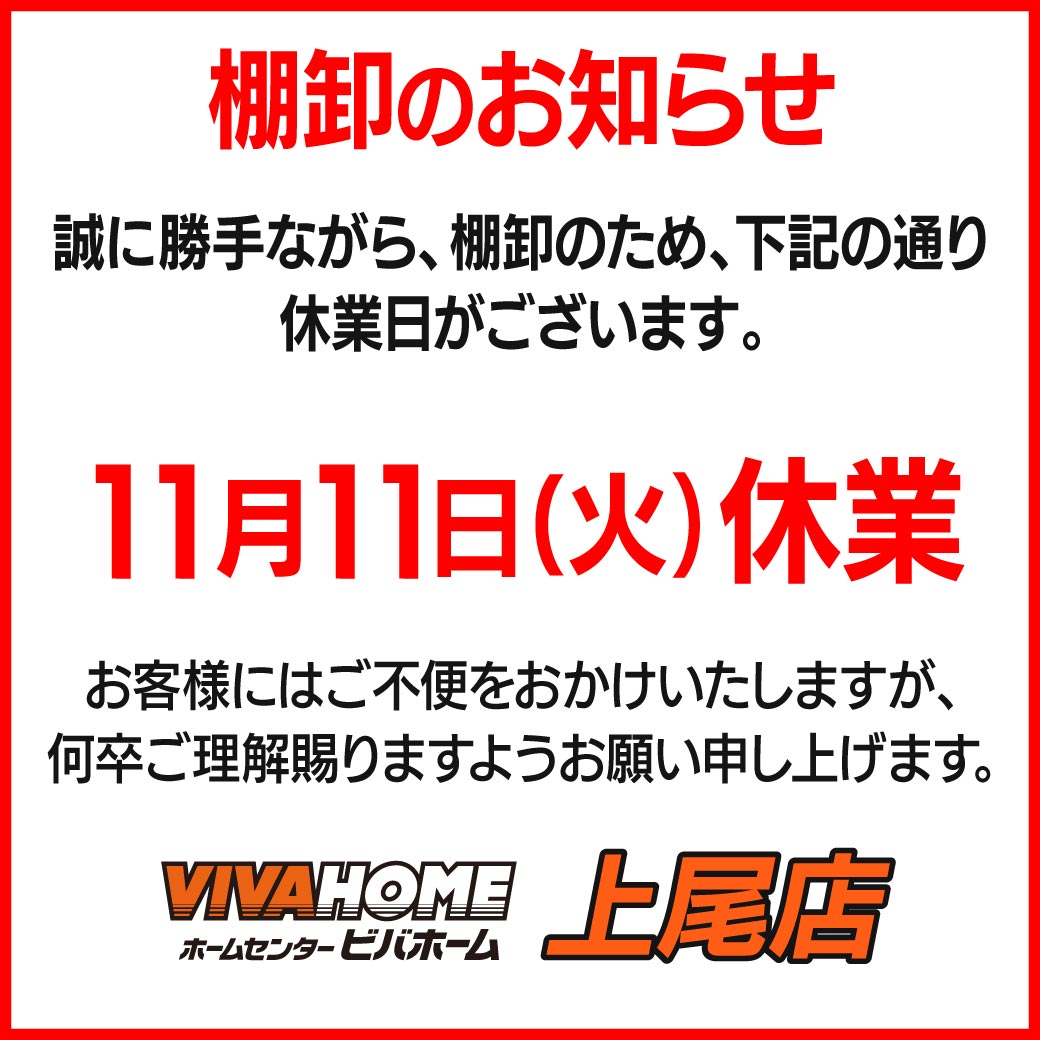 上尾店は、棚卸のため11月11日(火)は休業致します。 お客様にはご不便をおかけいたしますが、何卒ご理解賜りますようお願い申し上げます。