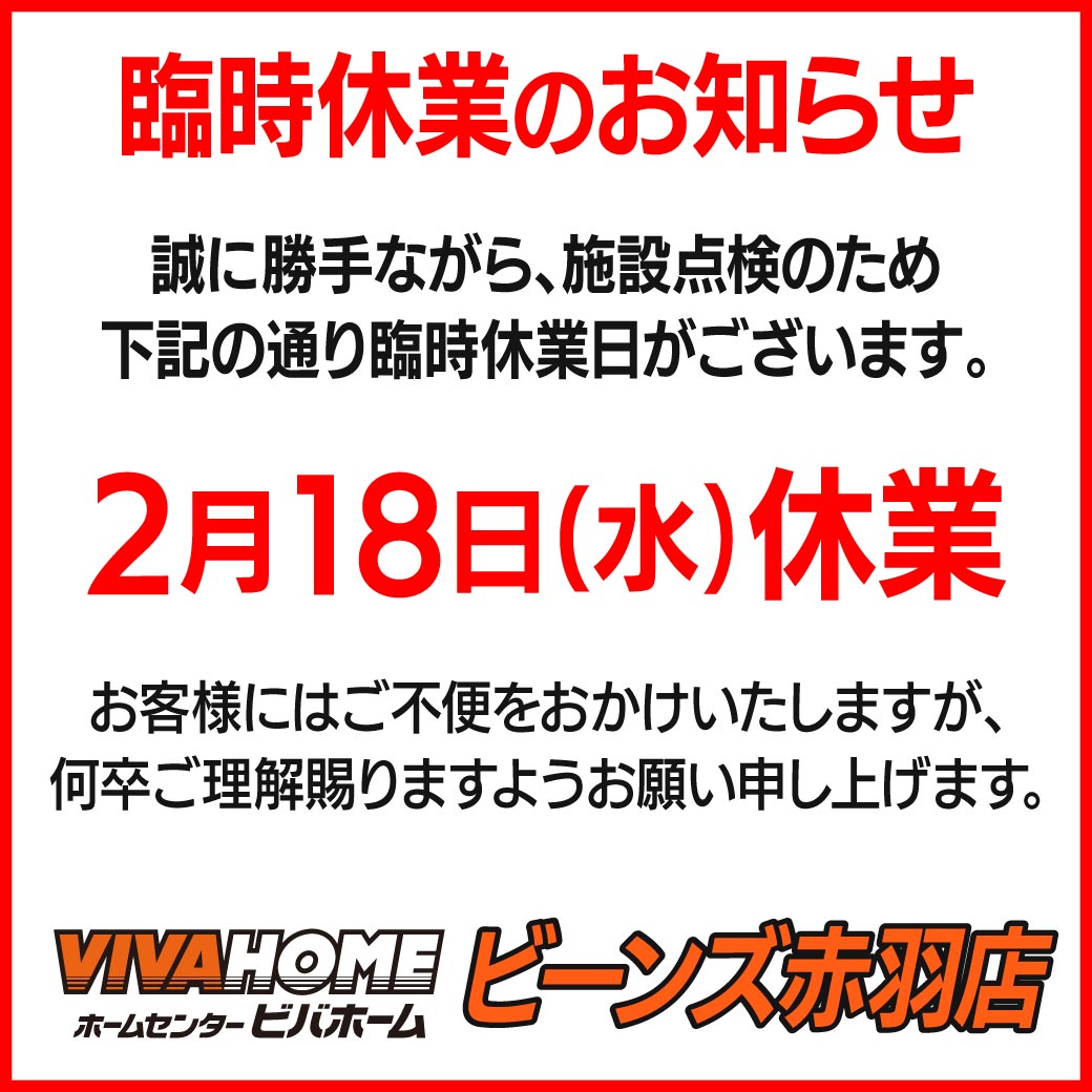 ビーンズ赤羽店は、施設点検のため2月18日(水)休業致します。 お客様にはご不便をおかけいたしますが、何卒ご理解賜りますようお願い申し上げます。