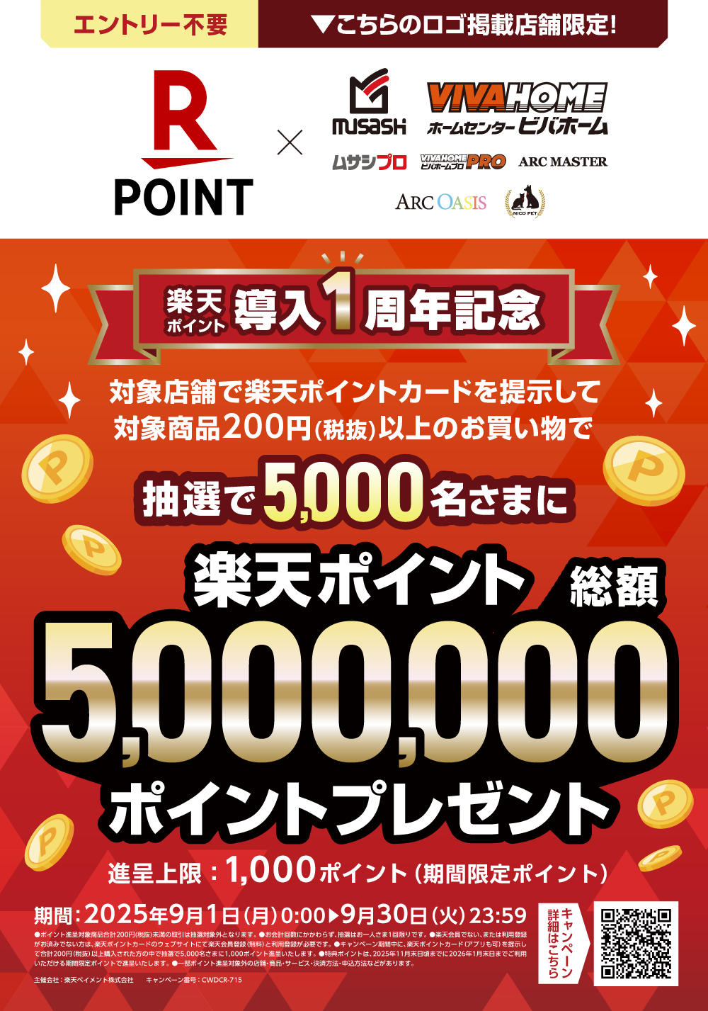 ※ポイント付与対象商品合計200円(税抜)未満の取引は抽選対象外となります。 ※オンラインショップは対象外です。※楽天会員でない、または利用登録がお済みでない方は、楽天ポイントカードのウェブページにて楽天会員登録(無料)と利用登録が必要です。※貯めたポイントのご利用には、利用登録(無料)が必要です。※キャンペーン期間中に、楽天ポイントカード(アプリも可)を提示して合計200円(税抜)以上購入された方の中で抽選で5,000名さまに1,000ポイント進呈いたします。※対象ブランド内一部店舗では導入しておりません。※特典ポイントは、2025年11月末日頃までに2026年1月末日までご利用いただける期間限定ポイントで進呈いたします。 ※一部ポイント進呈対象外の店舗・商品・サービス・決済方法・申込方法などがあります。※来月以降も同様のキャンペーンを実施する可能性があります。 【その他注意事項】 ※楽天会員から退会、楽天会員資格を喪失、または会員規約や利用規約などに違反している場合、特典は進呈できかねます。あらかじめご了承ください。※弊社が不正と合理的に判断した場合は、特典ポイント進呈の対象外となる場合がございます。※メンテナンスなどで、一時的にキャンペーンにご参加いただけない場合があります。あらかじめご了承ください。※本ページをアプリでご覧の際、一部のリンク先が表示されない場合があります。その場合は、大変お手数ですが、推奨環境にてご覧ください。※本キャンペーンのポイント進呈対象者は、同時期に行われている他のキャンペーンの対象から除外、または景品総額が景品表示法上の範囲内に制限される場合があります。あらかじめご了承ください。※本キャンペーンの参加にかかる費用(通信費など含む)は、お客さまご自身のご負担となります。あらかじめご了承ください。 ※天災地変や大規模システム障害などの影響により、実施または継続が困難と弊社が判断した場合、予告なくキャンペーンを中止する場合があります。あらかじめご了承ください。※楽天グループの役職員および関係者(業務委託、派遣社員、パートナースタッフ、アルバイト含む)は、本キャンペーンに参加できません。