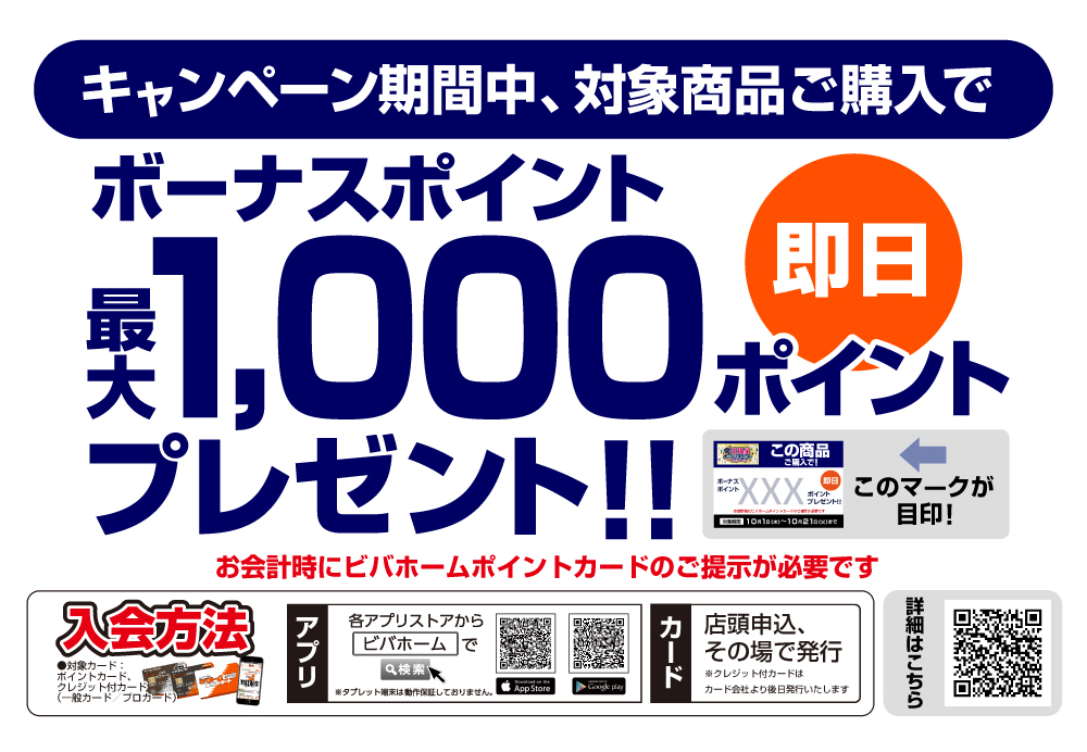ビバホーム倶楽部カードのボーナスポイント15~1,000ポイントプレゼント!