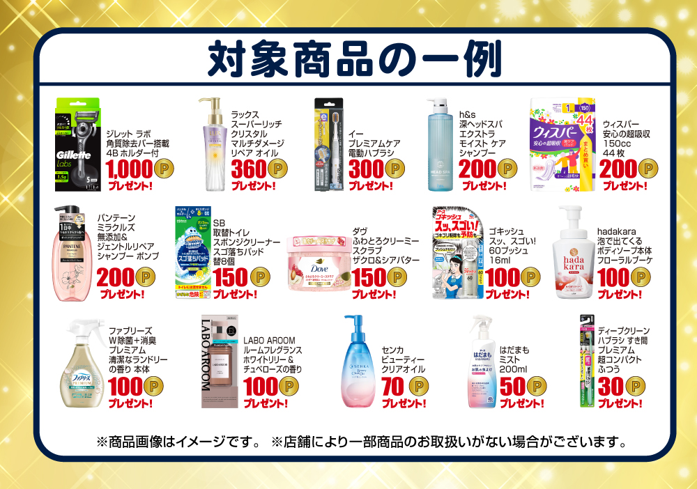 ジレットラボ、ラックススーパーリッチクリスタル、イー・プレミアム、h&s、ウィスパー、パンテーン、スクラビングバブル、ダヴふわとろクリーミースクラブ、ゴキッシュ、hadakara、ファブリーズ、LABO AROOM、センカ ビューティークリアオイル、はだまもミスト、ディープクリーンハブラシなどの商品が対象となります。