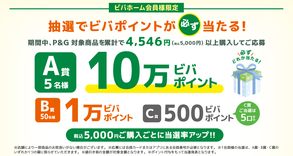 期間中、P&G対象商品を累計で4,546円(税込 5,000円)以上ご購入後、WEBへご応募いただくとビバホーム倶楽部カードのポイントが必ず当たる!🎁✨
