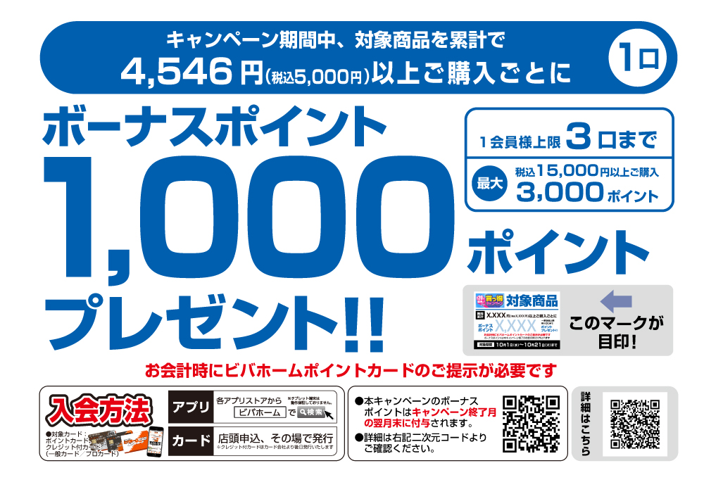 キャンペーン期間中、対象商品を累計で4,546円(税込5,000円)以上ご購入ごとにボーナスポイント1,000ポイントプレゼント!🎁
