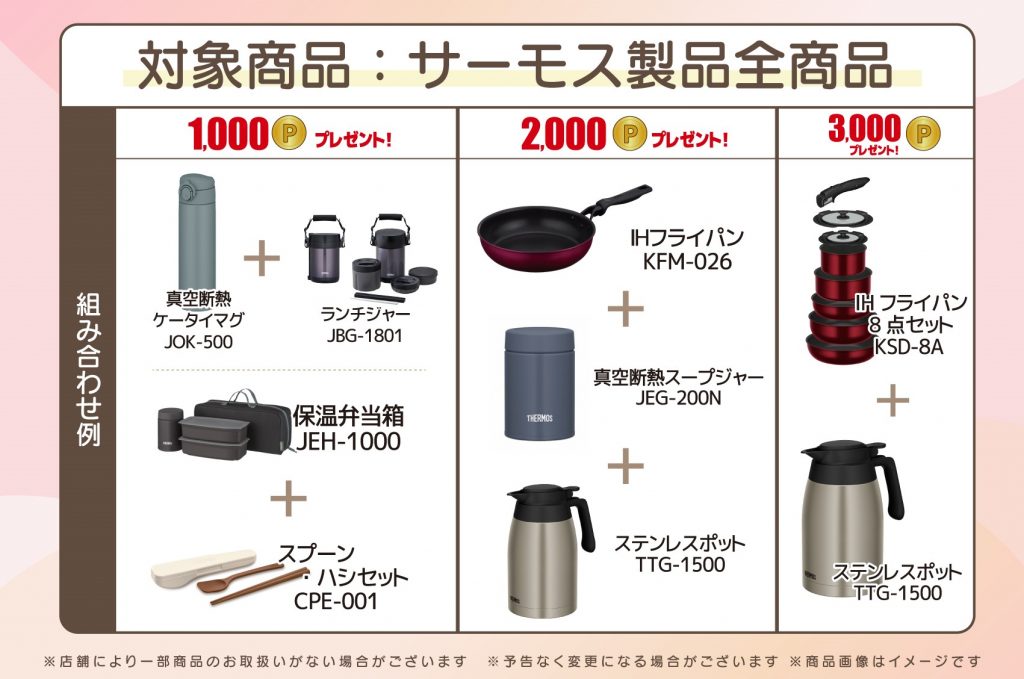 真空断熱ケータイマグ、ボトルポーチ、フライパン、炒め鍋、卵焼きパン、ステンレスポット、フライパンセット、スープジャー、ランチボックスなどのサーモス全商品が対象となります!✨
