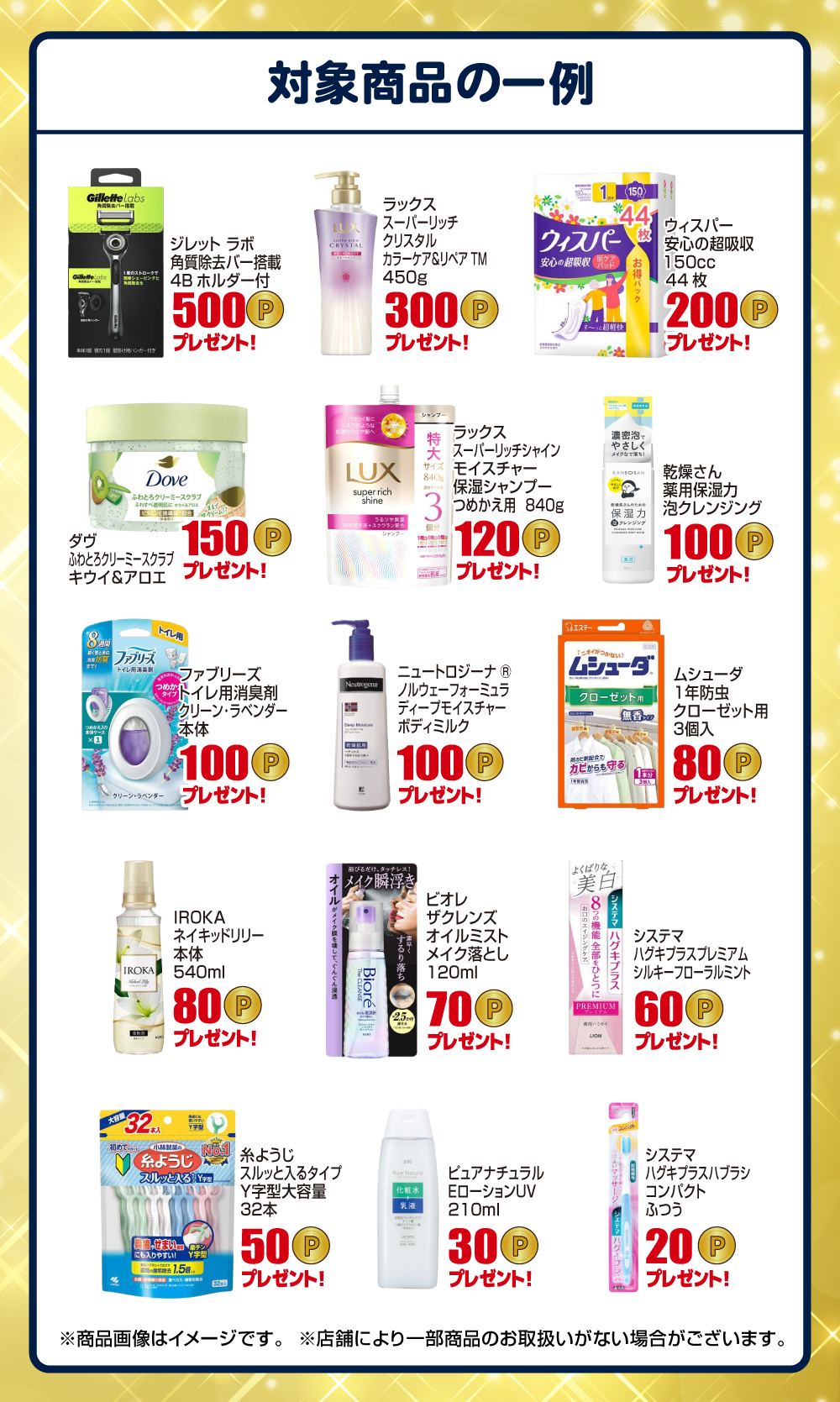 ジレットラボ、ラックススーパーリッチクリスタル、ウィスパー、ダヴふわとろクリーミースクラブ、乾燥さん薬用保湿力泡クレンジング、ファブリーズ、ニュートロジーナⓇ、ムシューダ、IROKA、ビオレザクレンズ オイルミストメイク落とし、システマハグキプラスプレミアム、糸ようじ、ピュアナチュラルEローションUV、システマハグキプラスハブラシなどの商品が対象となります。