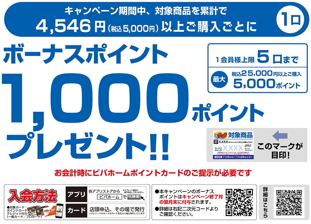 キャンペーン期間中、対象商品を累計で4,546円(税込5,000円)以上ご購入ごとにボーナスポイント1,000ポイントプレゼント!🎁