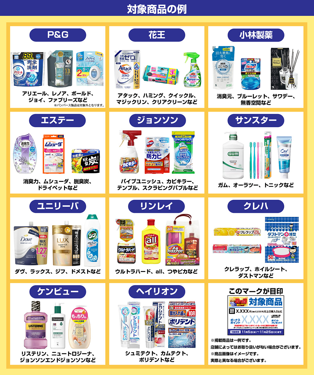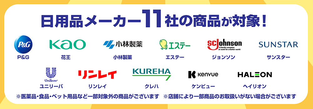 洗剤、シャンプー、ボディソープ、ベビー用品、入浴剤、オーラルケア、消臭剤などが対象となります!