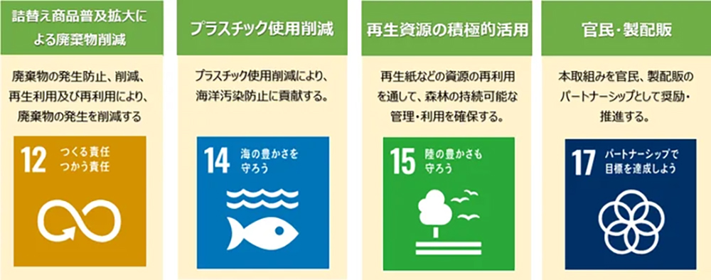 この取り組みは、消費者一人ひとりが、お買物を通じて3Rや資源の大切さを認識・共感し、日頃の消費行動(商品選択)へ結びつけてもらうことを目的としたキャンペーンです。当キャンペーンは「持続可能な開発目標(SDGs)」の、目標12「つくる責任 つかう責任」、目標14「海の豊かさを守ろう」、目標15「陸の豊かさも守ろう」、目標17「パートナーシップで目標を達成しよう」を推進しています。