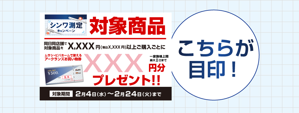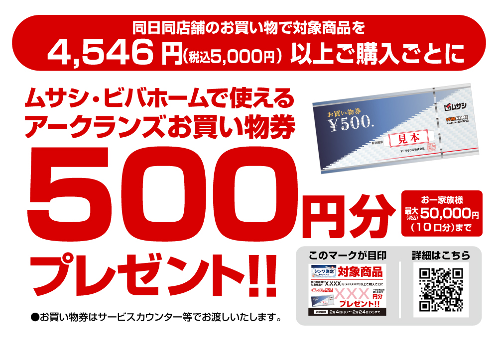 同日同店舗にて対象商品を4,546円(税込 5,000円)以上ご購入ごとに、ビバホーム・ムサシなどで使える