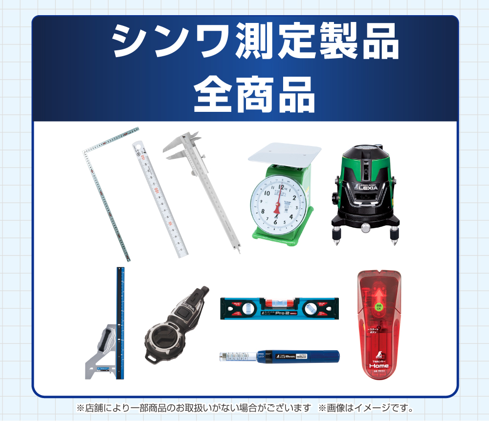 曲尺、直尺、アルミ製定規、樹脂製定規、竹製定規、スコヤ、止型、プロトラクター、ノギス、マイクロメーター、精密測定、パス、ゲージ、ケガキツール、溶接ツール、コンベックス、巻尺、水平器、レーザーロボ、光学測定、測量、墨付け、基準だしツール、丸ノコガイド定規、クランプ、下地探し、点検、吸着ツール、はかり、温度計、湿度計、製図などシンワ測定製品がほぼ全品対象!