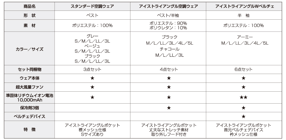 空調ウェア スペック比較表