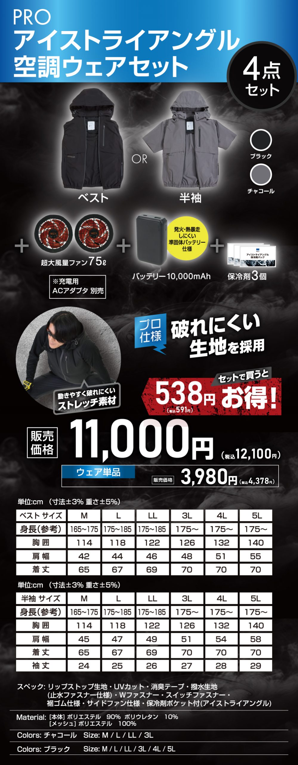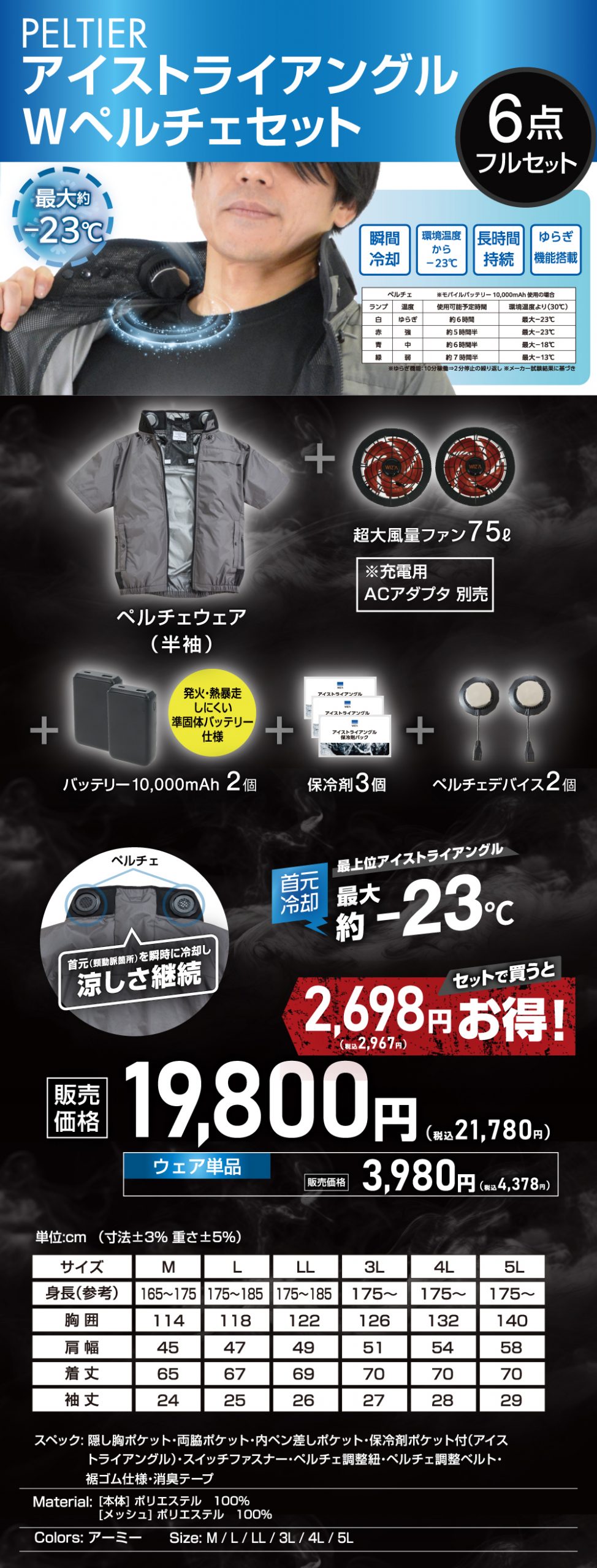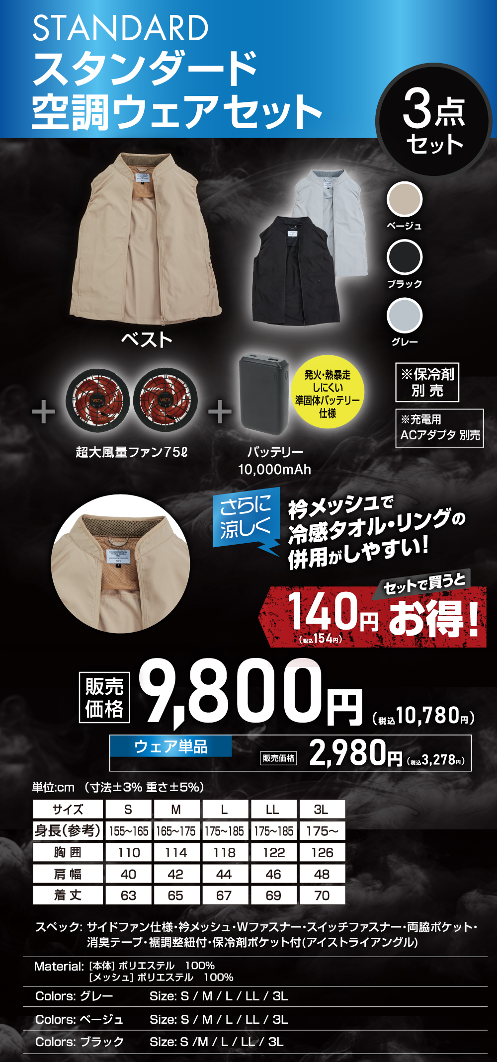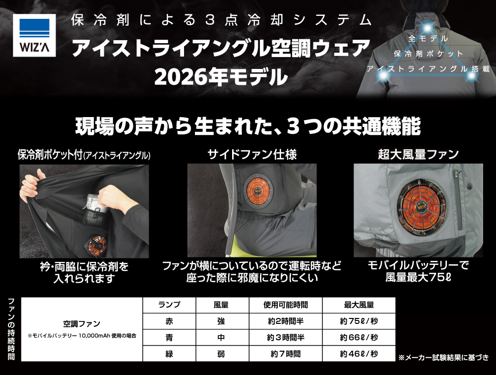 ビバホーム・ムサシの空調ウェアは、全モデルに保冷剤ポケットによる3点冷却システム「アイストライアングルを搭載。
