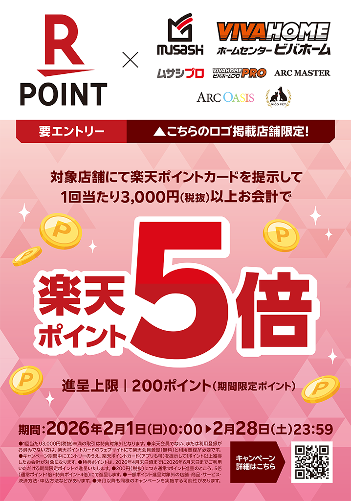 ●1回当たり3,000円(税抜)未満の取引は特典対象外となります。●楽天会員でない、または利用登録がお済みでない方は、楽天ポイントカードのウェブサイトにて楽天会員登録(無料)と利用登録が必要です。●キャンペーン期間中にエントリーのうえ、楽天ポイントカード(アプリも可)を提示して1ポイント以上獲得したお会計が対象になります。●特典ポイントは、2026年4月末日頃までに2026年6月末日までご利用いただける期間限定ポイントで進呈いたします。●200円(税抜)につき通常1ポイント進呈のところ、5倍(通常ポイント1倍+特典ポイント4倍)にて進呈します。●一部ポイント進呈対象外の店舗・商品・サービス・決済方法・申込方法などがあります。●来月以降も同様のキャンペーンを実施する可能性があります。