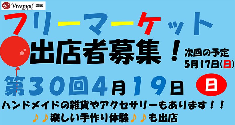 第30回フリーマーケットを開催します! 【実施内容】 開催日/第30回 2026年4月19日(日) 会場/ビバモール加須 1番街フードプラザ マクドナルド前 【加須市下高柳1丁目29番】 開催時間/10:00~15:00…