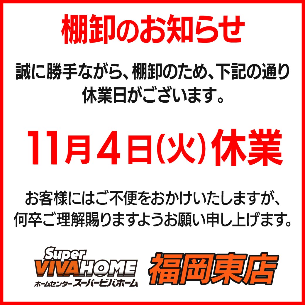 福岡東店は、棚卸のため11月4日(火)は休業致します。 お客様にはご不便をおかけいたしますが、何卒ご理解賜りますようお願い申し上げます。
