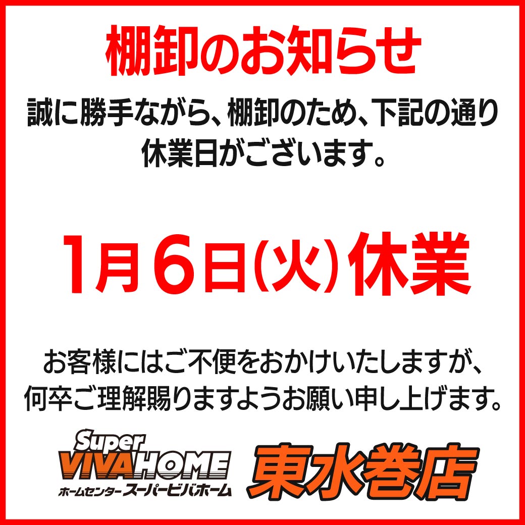 スーパービバホーム東水巻店は、棚卸しのため、1/6(火)は臨時休業とさせていただきます。