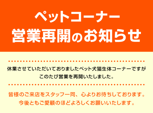 平素より当店をご利用いただき、誠にありがとうございます。 ペット生体販売エリアにつきまして、休業させていただいておりましたが、このたび営業を再開いたしました。 今後ともご愛顧のほどよろしくお願いいたします。