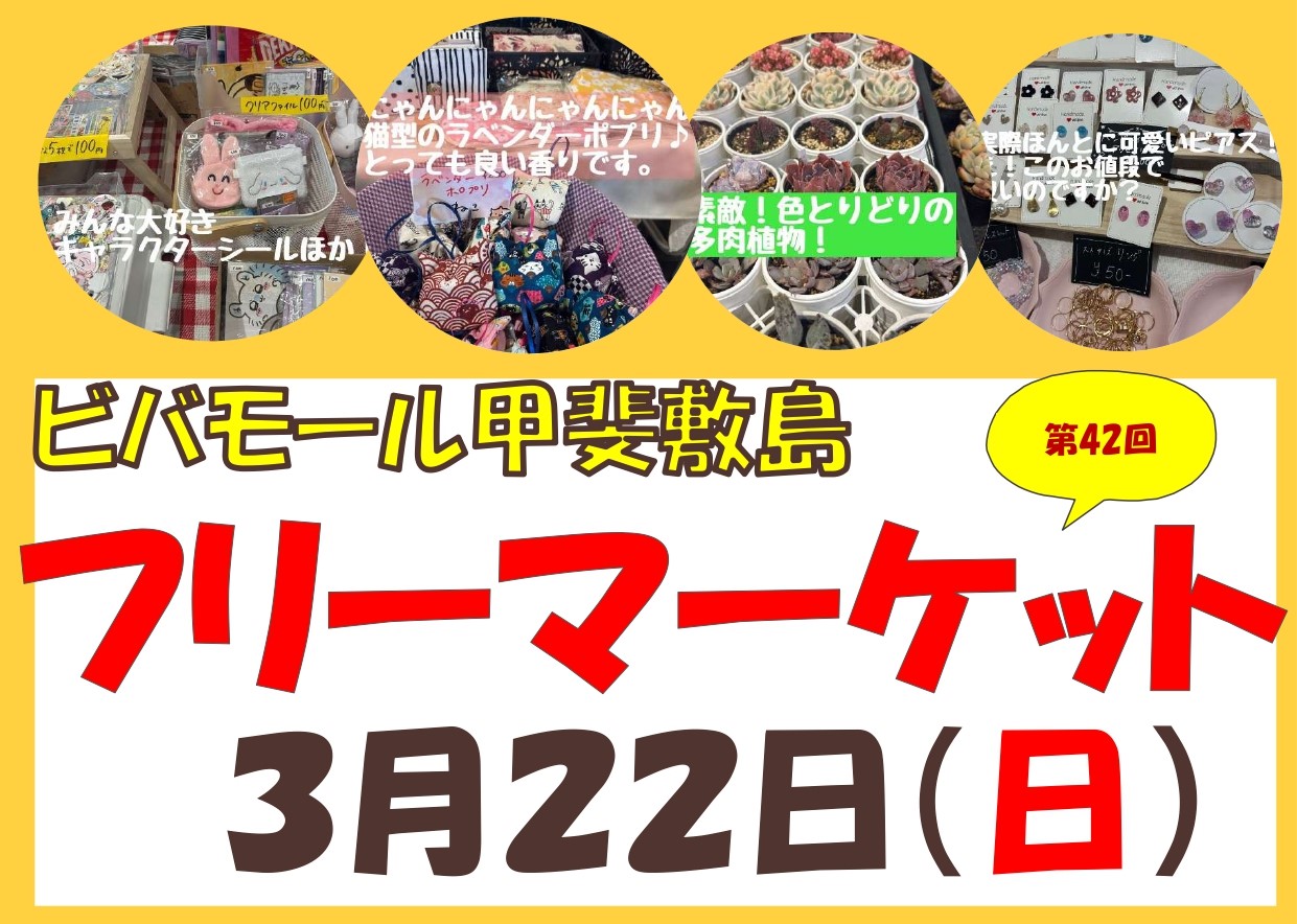 ビバモール甲斐敷島2階特設会場で第40回フリーマーケットを開催します!✨ 【実施内容】 開催日/第40回2月22日(日) 会場/ビバモール甲斐敷島 2階 特設会場 開催時間/10:00~15:00 予定 (…