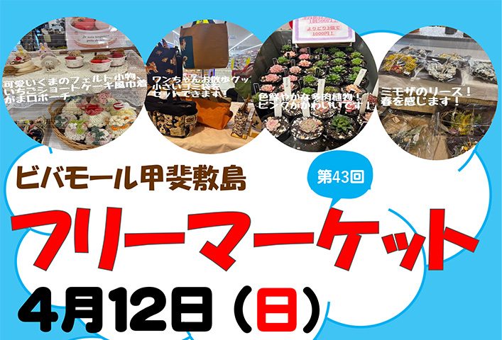 ビバモール甲斐敷島2階特設会場で第43回フリーマーケットを開催します✨ 【実施内容】 開催日/第43回4月12日(日) 会場/ビバモール甲斐敷島 2階 特設会場 開催時間/10:00~15:00 予定 (搬…