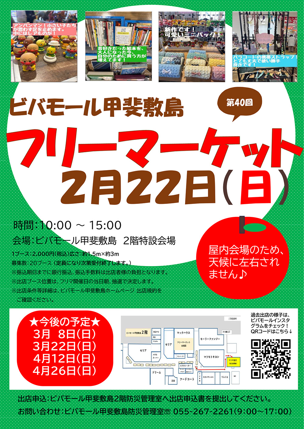 ・その他の出店条件につきましては 『ビバモール甲斐敷島 フリーマーケット出店規約』に準じます。