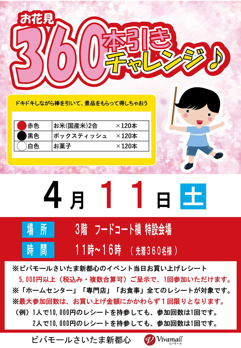 【参加条件】ビバモールさいたま新都心のイベント当日のお買い上げレシート5,000円以上(税込み・複数合算可)ご呈示で、1回ご参加いただだけます。