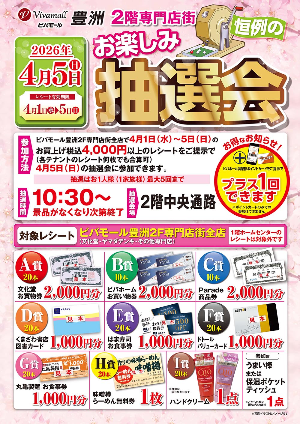 ビバモール豊洲2F専門店街全店で4月1日(水)~4月5日(日)のお買い上げレシート 4,000円(税込)以上をご提示で(各テナントのレシート何枚でも合算可)4/5(日)開催の抽選会に参加できます。