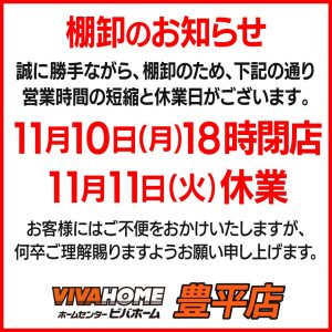 ビバホーム豊平店は、棚卸のため11月10日(月)は18時に閉店、11月11日(火)は休業致します。