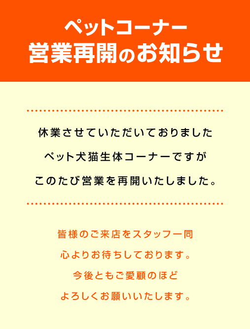 ペット生体販売エリアにつきまして、休業させていただいておりましたが、このたび営業を再開いたしました。