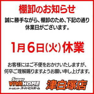 スーパービバホーム津白塚店は、棚卸しのため、1/6(火)は臨時休業とさせていただきます。