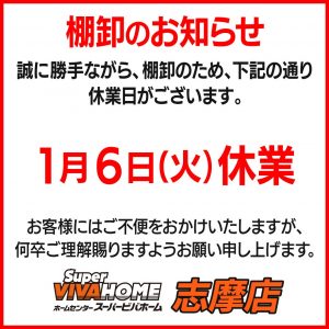 スーパービバホーム志摩店は、棚卸しのため、1/6(火)は臨時休業とさせていただきます。