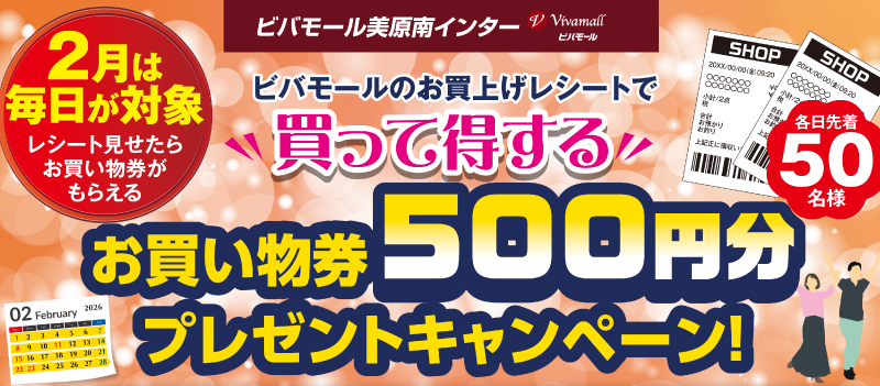 2月は毎日が対象✨買って得する!お買い物券500円分プレゼントキャンペーン! STEP1:ビバモール美原南インターの対象店舗で当日に5,000円以上(税込・複数店舗の合算可)のお買い物! STEP2:スーパ…