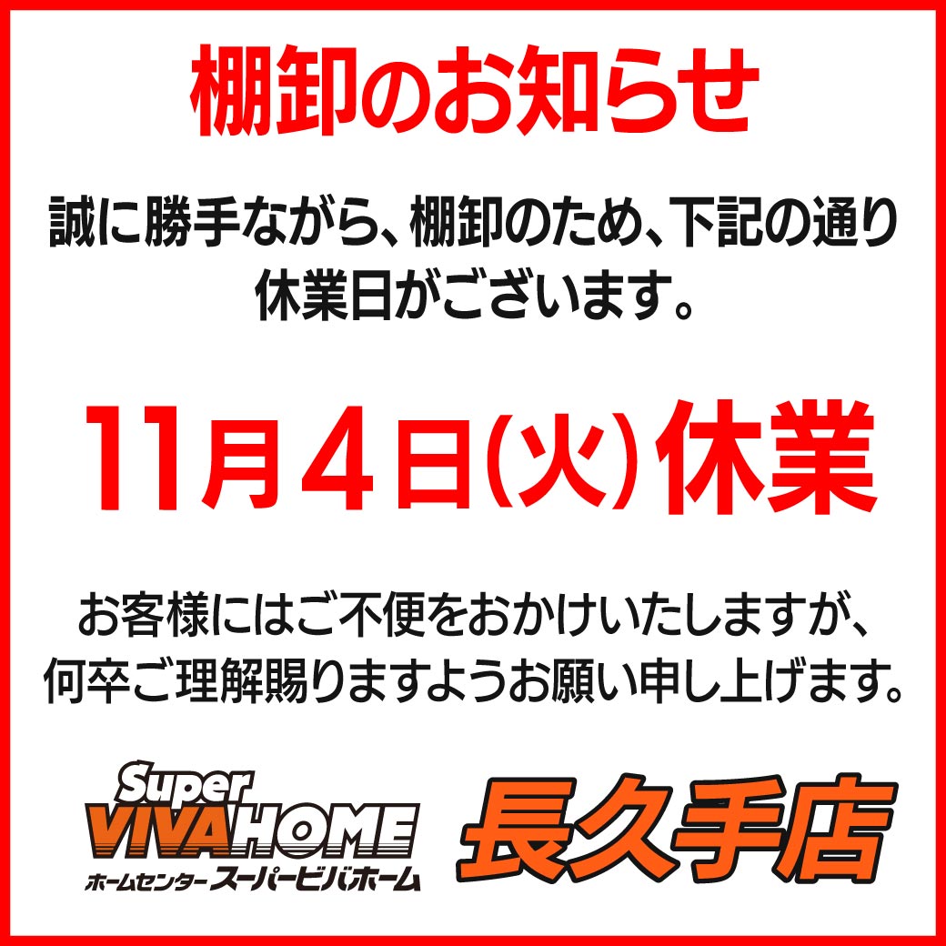 長久手店は、棚卸のため11月4日(火)は休業致します。 お客様にはご不便をおかけいたしますが、何卒ご理解賜りますようお願い申し上げます。