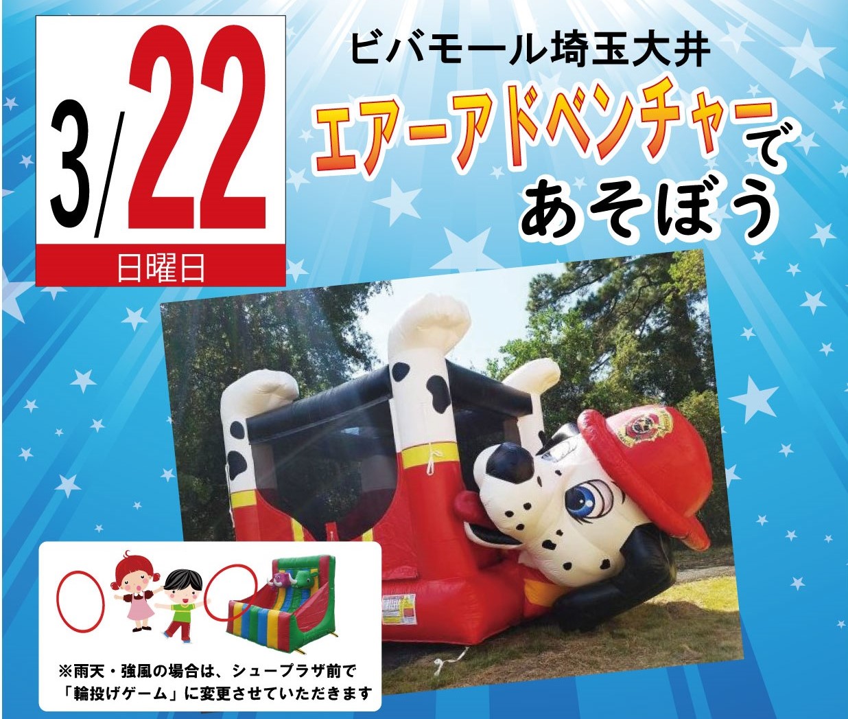 エアーアドベンチャーであそぼう!🎈 【開催日時】3/22(日)11:00~16:00 【場所】プラザ棟 ドトールコーヒー前 【参加条件】ビバモール埼玉大井でイベント当日・3月22日(日)にお買い上げレシー…