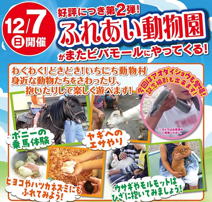 ふれあい動物園がビバモールにやってくる!🐴🐰✨ 【実施内容】●開催 12月7日 (日) ●場所 ホームセンター正面入口横 ●開催時間10:00~15:00(12:…