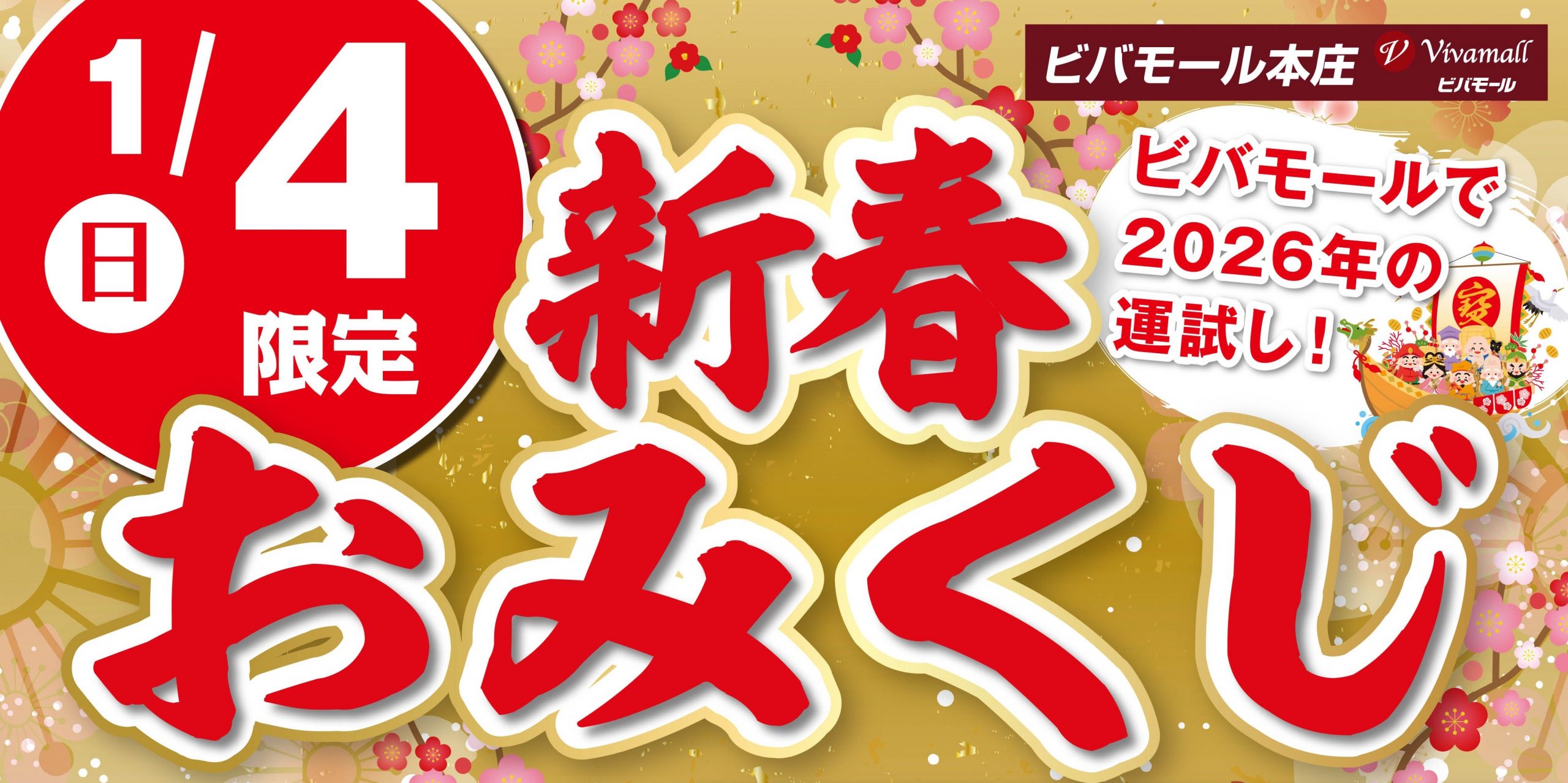 ビバモールで2026年の運試し!新春おみくじ🎍 日時:2026年1月4日(日) 10:30~(ハズレ無し!景品がなくなり次第終了) 会場:ビバモール本庄1階 お待ち広場 ※こちらでレシートをご提示ください…