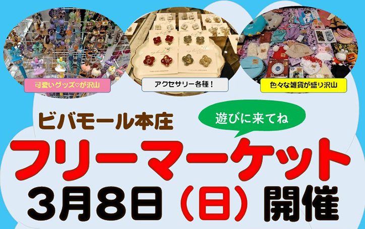 ビバモール本庄フリーマーケット出店者募集!✨ 【実施内容】●開催 3月8日 (日) ★以降も現在日曜日開催予定!(今後変更も有り) ●会場 ビバモール本庄 1階 お待ち広場 ★屋内会場なので天候…