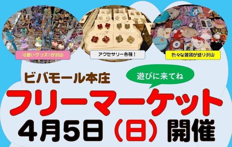 ビバモール本庄フリーマーケット出店者募集!✨ 【実施内容】●開催 4月5日 (日) ★以降も現在日曜日開催予定!(今後変更も有り) ●会場 ビバモール本庄 1階 お待ち広場 ★屋内会場なので天候に左右され…