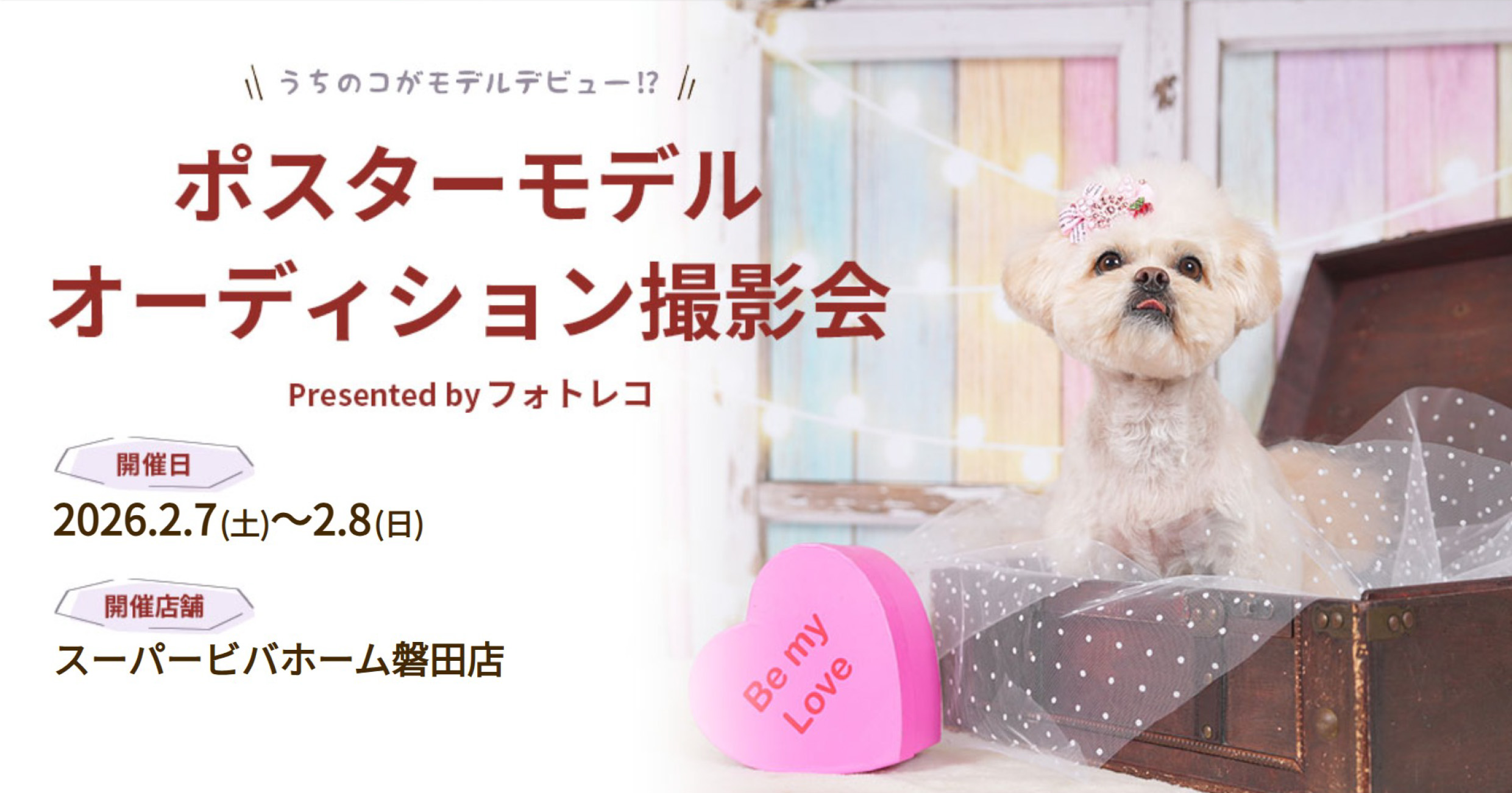 ペットポスターモデルオーディション撮影会を開催します♪ ★事前ご予約特典★事前予約の上ご参加いただいた方全員に、撮影したお写真で作るうちのコオリジナルキーホルダーをプレゼント! 日 程:2026年2月7日(土)・8日(日…