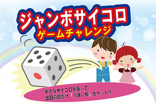 🎲ジャンボサイコロゲームチャレンジ🎲大きなサイコロを振って出目の数だけ「うまい棒」をゲット♪ 【開催日時】2/7(土)11:00~16:00(先着300名様) 【場所】3階 フードコート前…