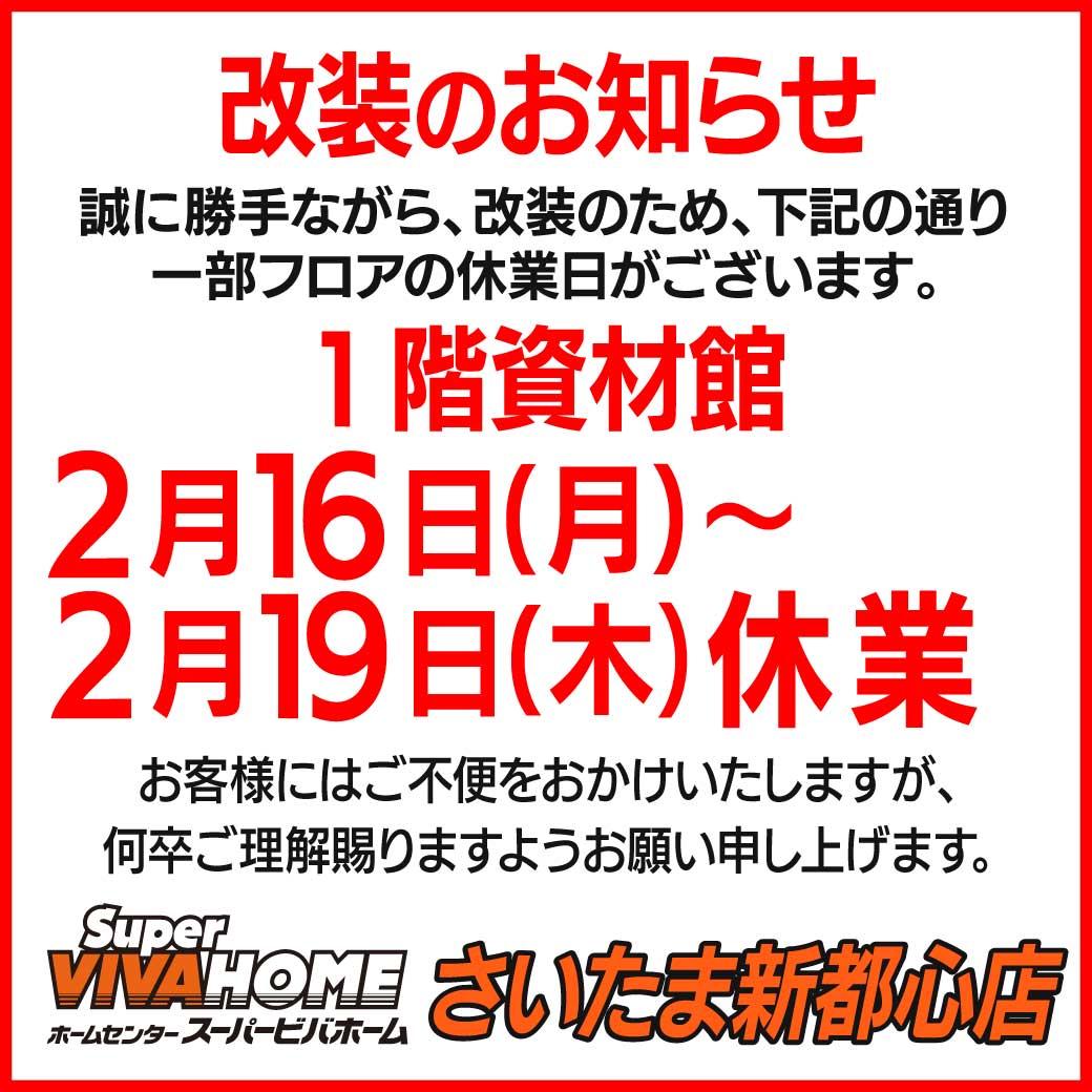 さいたま新都心店は、改装のため2月16日(月)から2月19日(木)まで、1階資材館のみ休業致します(2階フロアは通常営業) お客様にはご不便をおかけいたしますが、何卒ご理解賜りますようお願い申し上げます。
