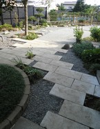 庭全面が芝張りのため、雨上がり後の水捌けを解消するために、全面天然石の乱張りの石畳にしました。花壇や土留なども天然石の石材で統一し、水捌け機能とアクセントを兼ねて砕石目地を設けました。庭内に立つ電柱は、花壇ラインに曲線を用いて交わすことで、デザインとして吸収させるようにしました。デッキはメンテナンス不要の人工木に替え、床下も見えないように幕板で隠してあります。全体を褐色、ブラウン系でまとめて統一感を図りました。