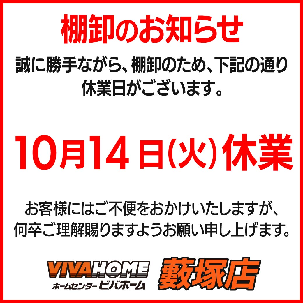 藪塚店は、棚卸のため10月14日(火)は休業致します。 お客様にはご不便をおかけいたしますが、何卒ご理解賜りますようお願い申し上げます。